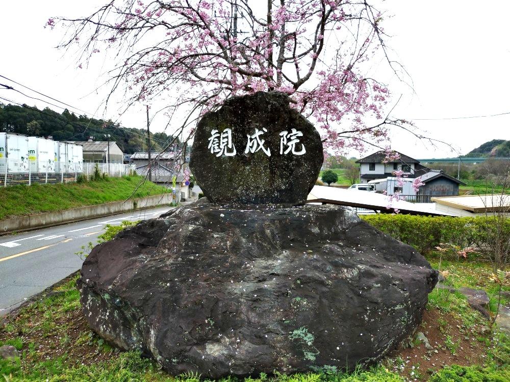 駐車場に咲くソメイヨシノを背景にした観成院の看板石。